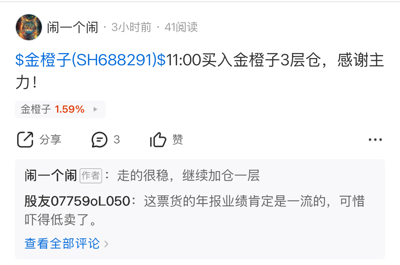 $金橙子(SH688291)$ 恭喜主力创新高,昨日实盘4层仓位,今日开盘再加一层仓,一共5层仓位,获利13%,感谢主力,继续持股!