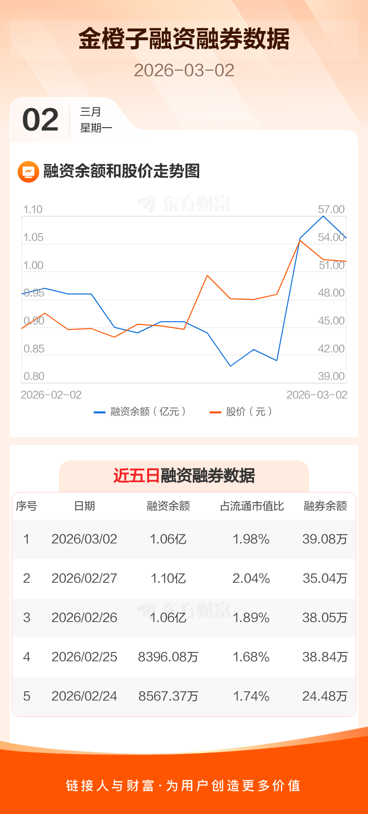 交易所最新数据显示,金橙子于2026年3月2日获融资买入2759.97万元,融资偿还3137.27万元,当日融资净偿还377.3万元。目前,该股融资余额1.06亿,占流通市值比例为1.98%。