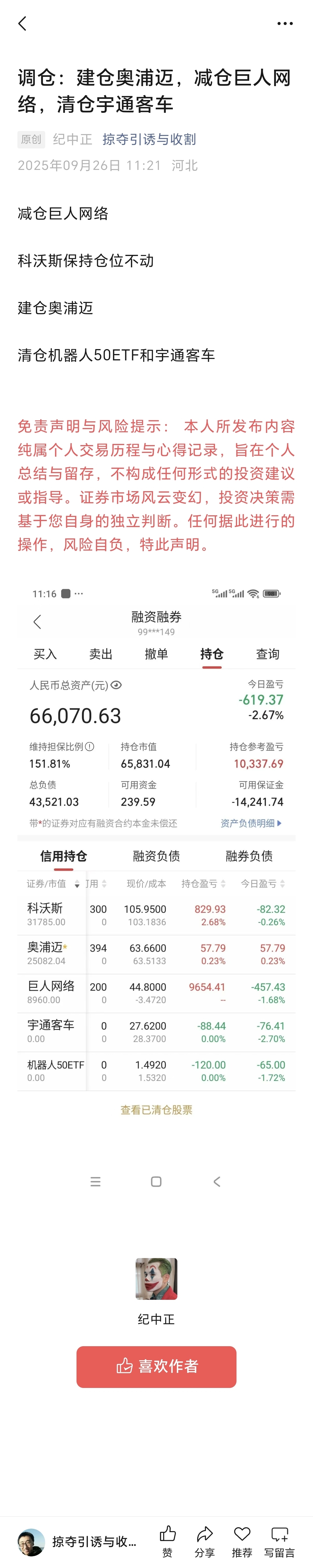 调仓:建仓奥浦迈,减仓巨人网络,清仓宇通客车