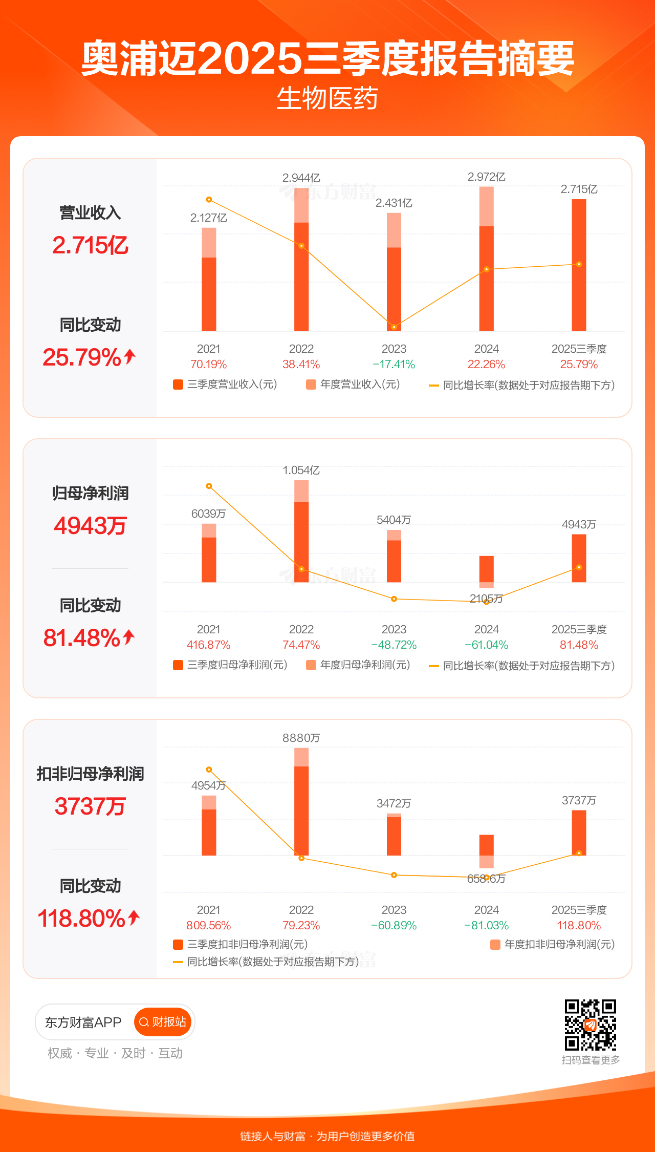 奥浦迈10月30日发布2025年三季报显示,公司前三季实现营业收入2.72亿元,同比增长25.79%;归母净利润4942.53万元,同比增长81.48%;扣非归母净利润3736.92万元,同比增长118.80%。