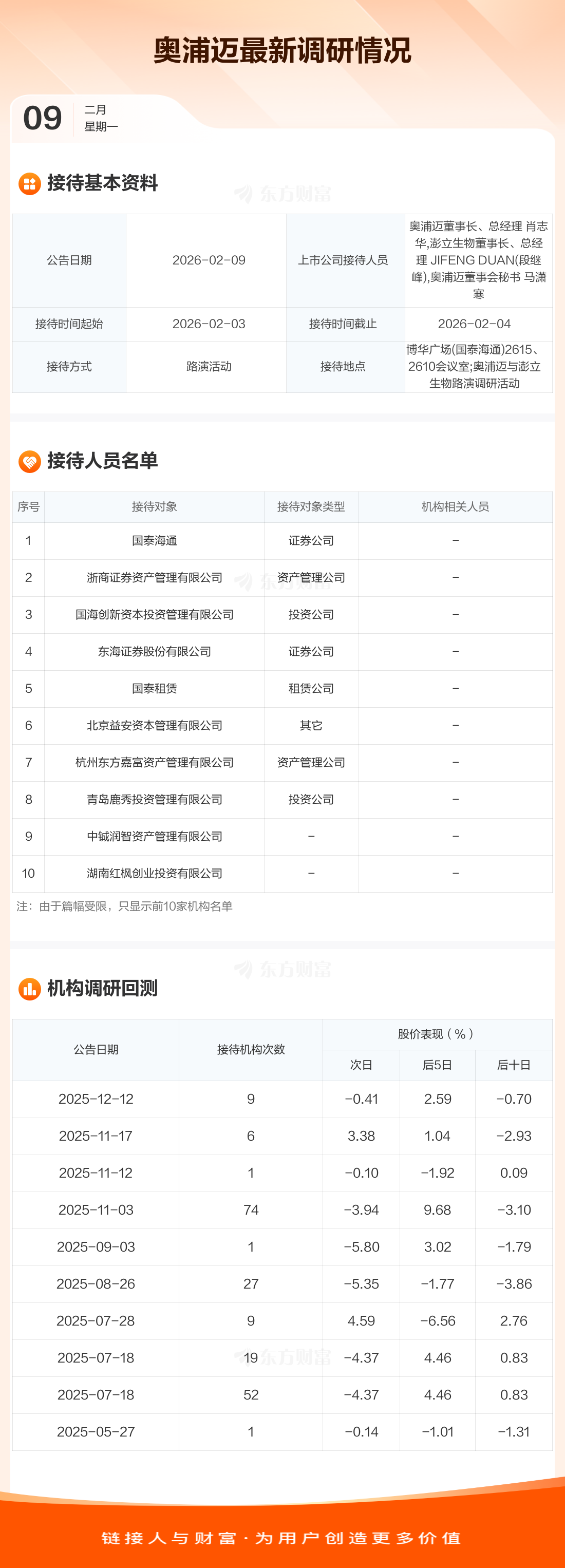 奥浦迈2月9日公告称,2月3日至2月4日接待国泰海通等61家机构调研。接待人员包括奥浦迈董事长、总经理 肖志华,澎立生物董事长、总经理 JIFENG DUAN(段继峰),奥浦迈董事会秘书 马潇寒。