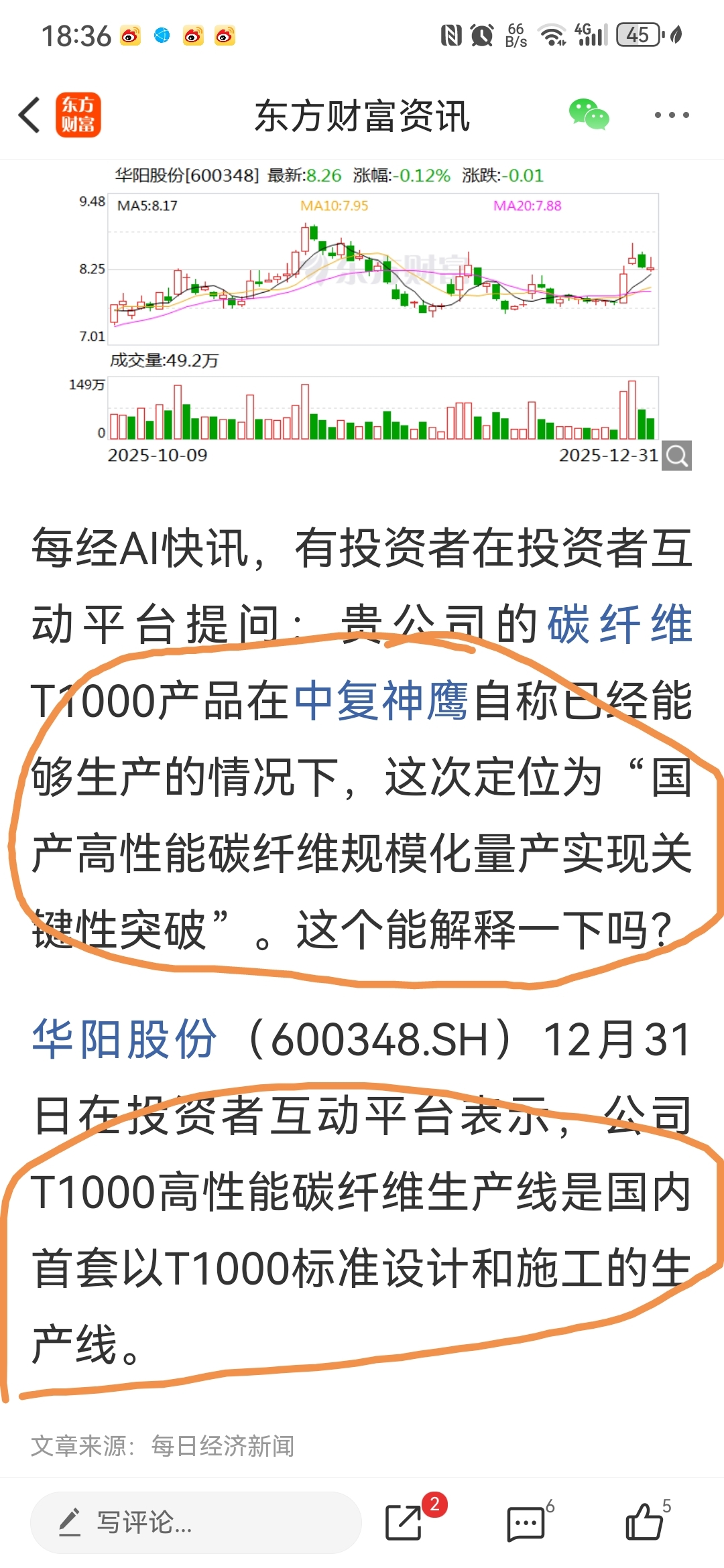 $中复神鹰(SH688295)$ 董秘出来解释一下——华阳股份(600348.SH)12月31日在投资者互动平台表示,公司T1000高性能碳纤维生产线是国内首套以T1000标准设计和施工的生产线。