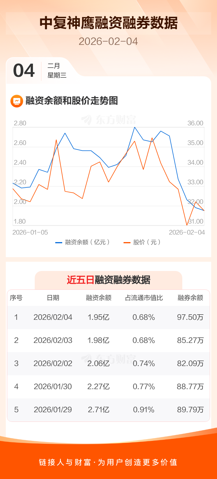 交易所最新数据显示,中复神鹰于2026年2月4日获融资买入1049.00万元,融资偿还1379.44万元,当日融资净偿还330.44万元。目前,该股融资余额1.95亿,占流通市值比例为0.68%。