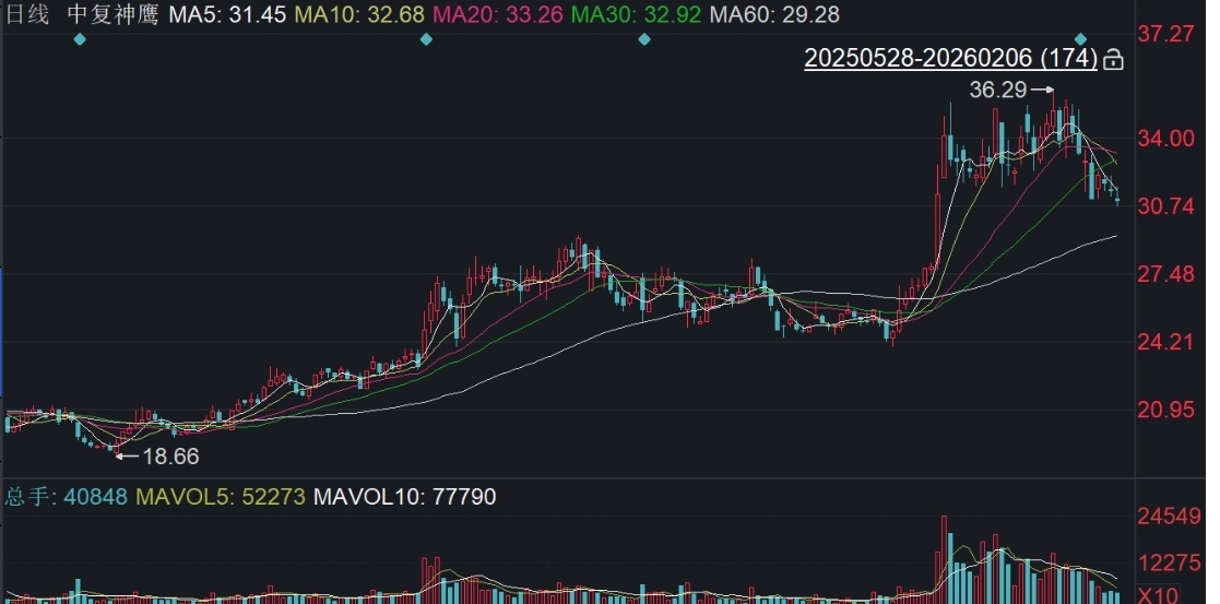 二级市场上,截至2月6日收盘,中复神鹰下跌1.62%报30.90元/股,总市值约278.10亿元,近一年来公司股价累计上涨约67%。