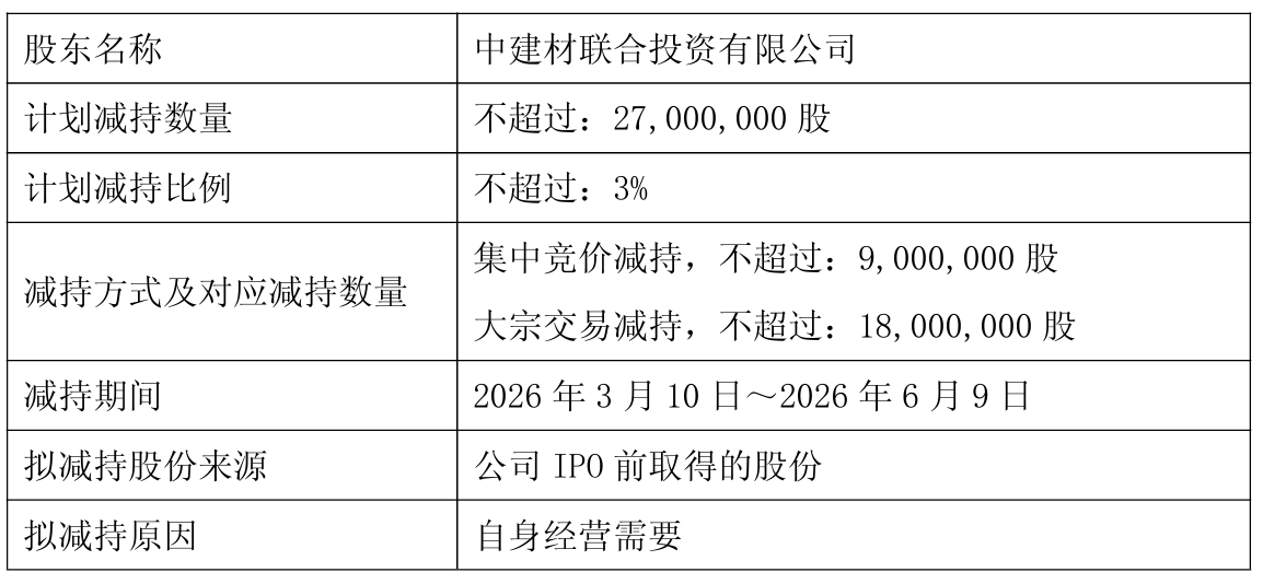 2月8日,中复神鹰(688295)发布公告称,公司控股股东中联投资因自身经营需要,拟在3月10日至6月9日期间,通过集中竞价交易及大宗交易方式减持公司股份合计不超过2700万股,即不超过公司总股本的3%。