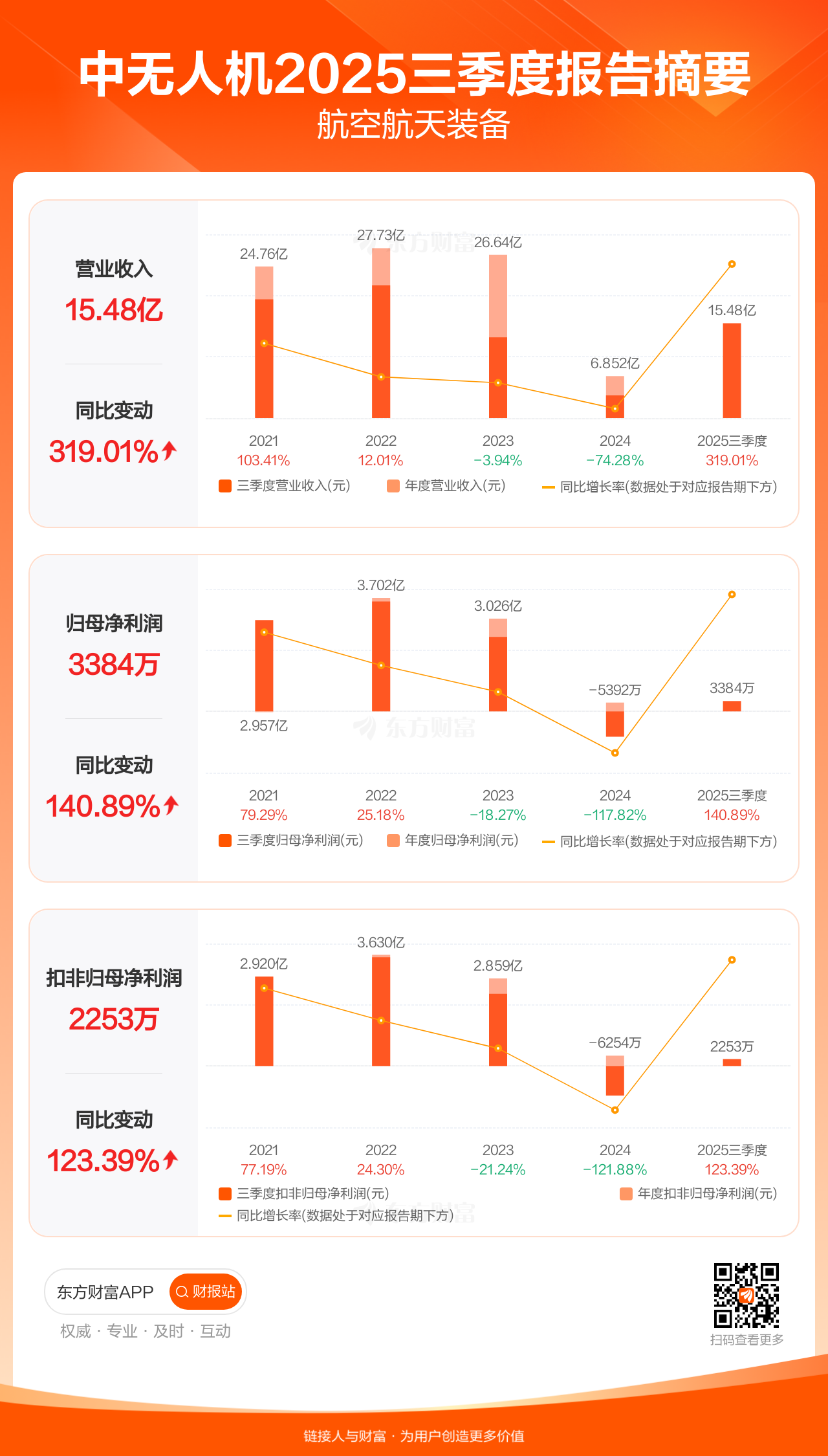中无人机10月31日发布2025年三季报显示,公司前三季实现营业收入15.48亿元,同比增长319.01%;归母净利润3383.98万元,同比增长140.89%;扣非归母净利润2252.76万元,同比增长123.39%。