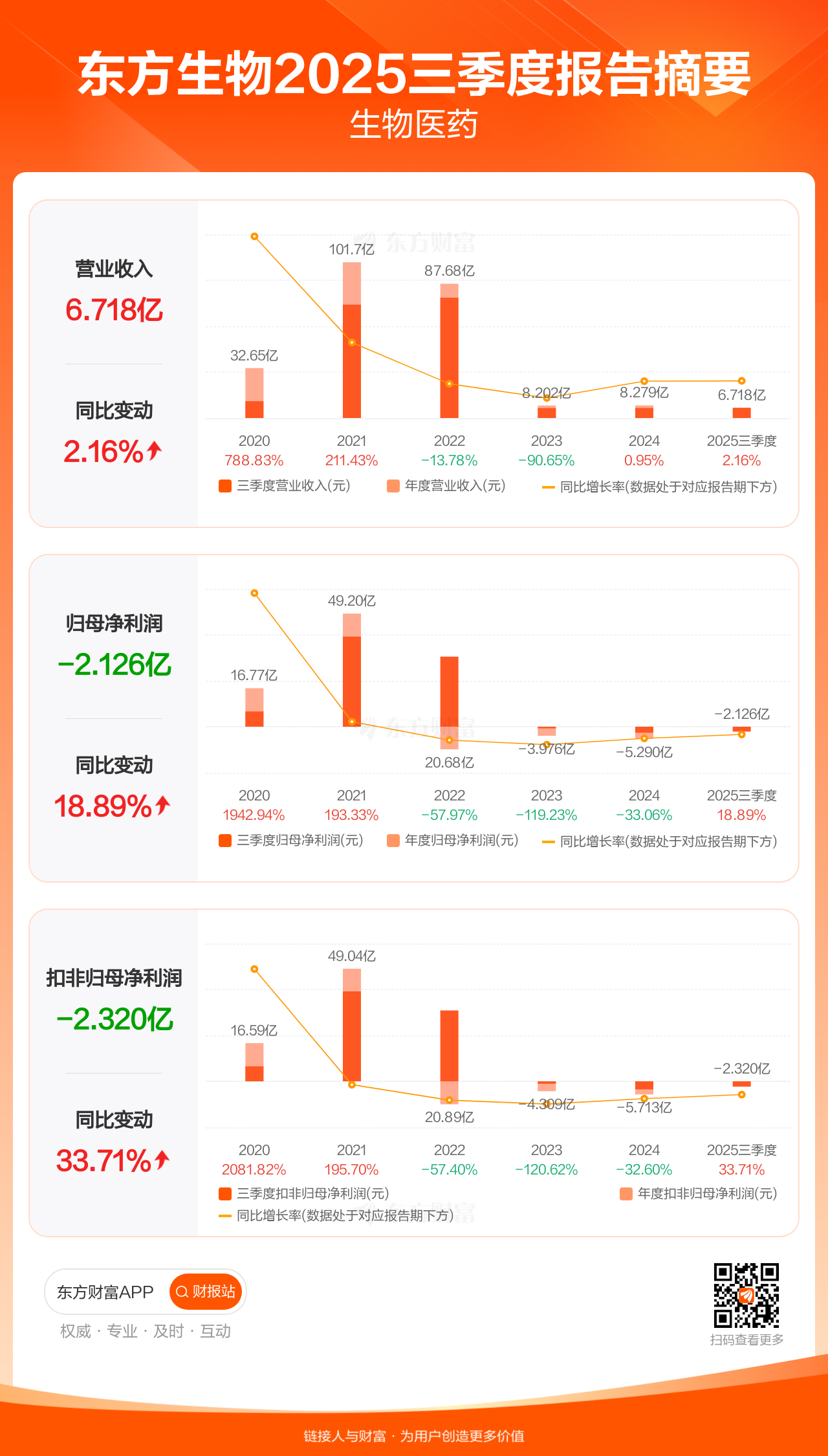 东方生物10月31日发布2025年三季报显示,公司前三季实现营业收入6.72亿元,同比增长2.16%;归母净利润-2.13亿元;扣非归母净利润-2.32亿元。
