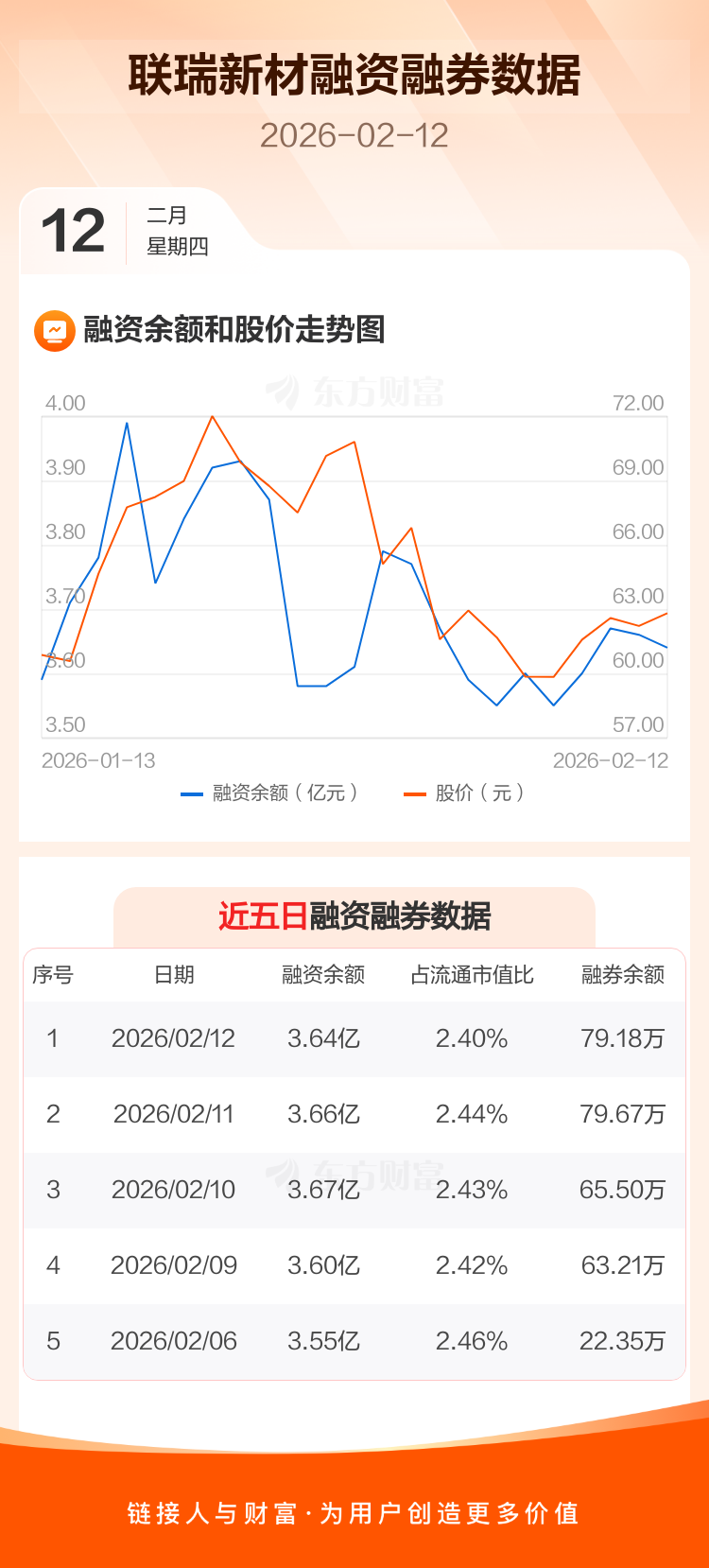 交易所最新数据显示,联瑞新材于2026年2月12日获融资买入2952.64万元,融资偿还3200.22万元,当日融资净偿还247.58万元。目前,该股融资余额3.64亿,占流通市值比例为2.40%。