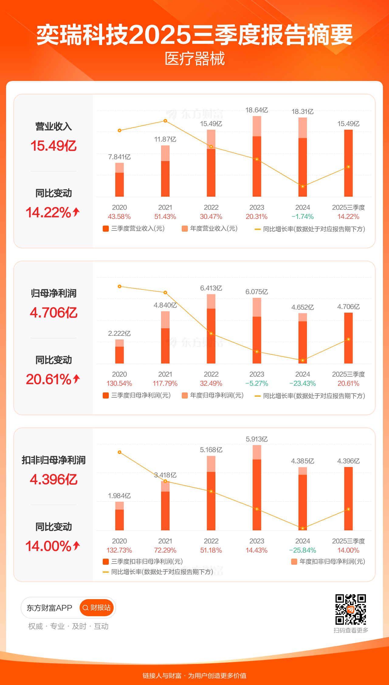 奕瑞科技10月29日发布2025年三季报显示,公司前三季实现营业收入15.49亿元,同比增长14.22%;归母净利润4.71亿元,同比增长20.61%;扣非归母净利润4.40亿元,同比增长14.00%。