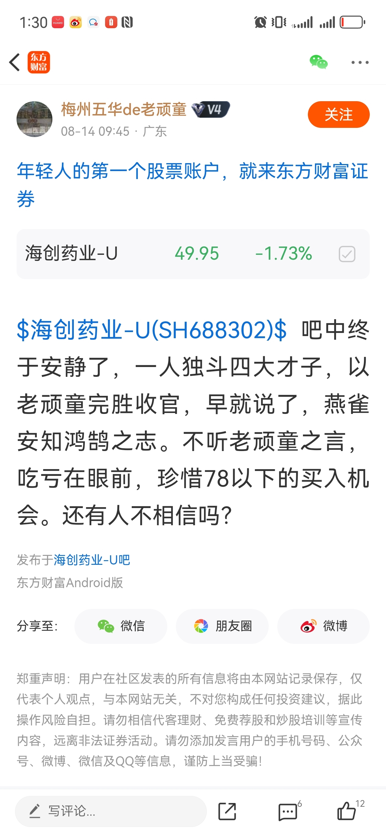 $海创药业-U(SH688302)$ 致梅州老怪,你以为只有你会截图吗,那就都翻翻旧账,大家看下海创见顶那几天老怪的言论,珍惜78以下!不得不发!说60以下已经给你面子了,念在71是个高点,谁都不是神仙能预测,就拿趋势形成后的60元以下说事,没想到你还倒打一耙,那就都晒出来让大家看看。
