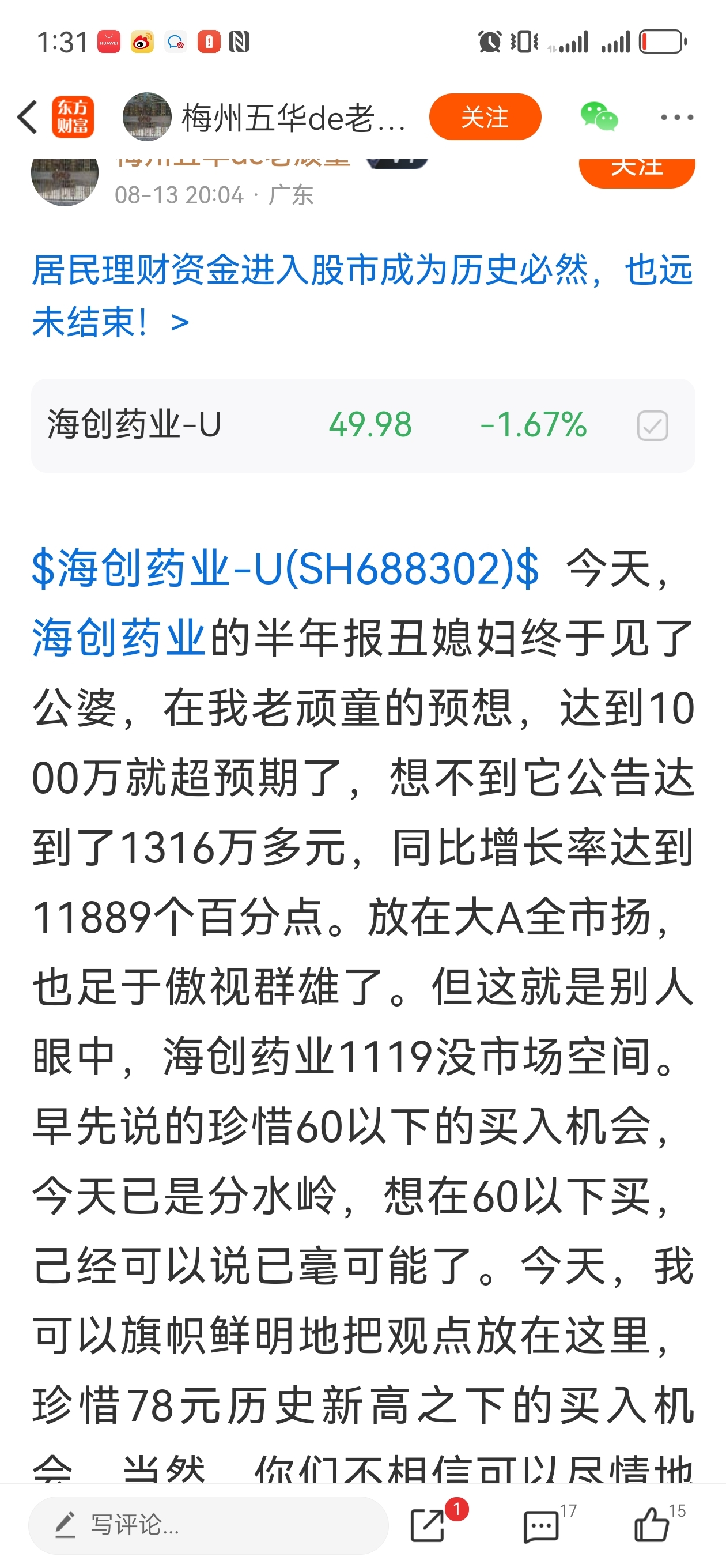 梅州这个货它居然在70多说过海创今年销量要有4个亿这种话,完全无脑吹,忽悠人。说实话,能有8千万已经是超预期了,而且这个人不懂创新药,居然敢乱吹