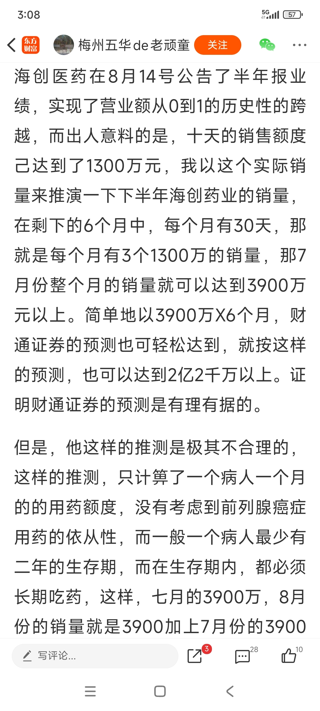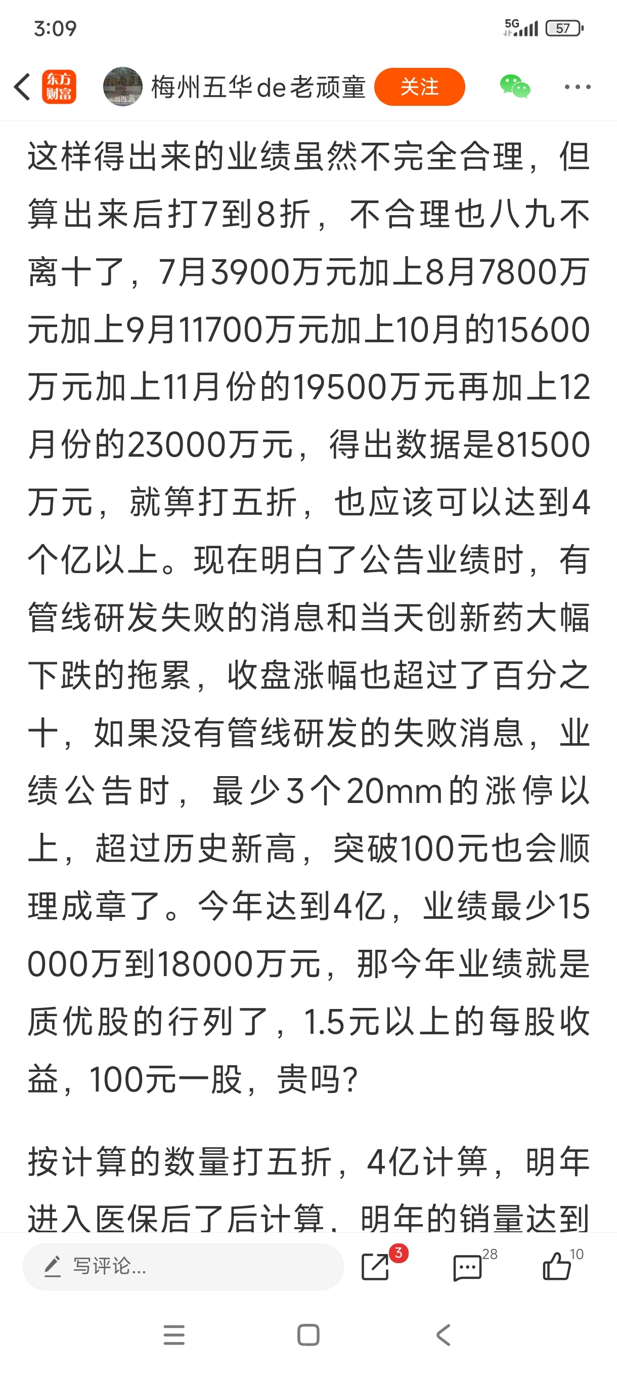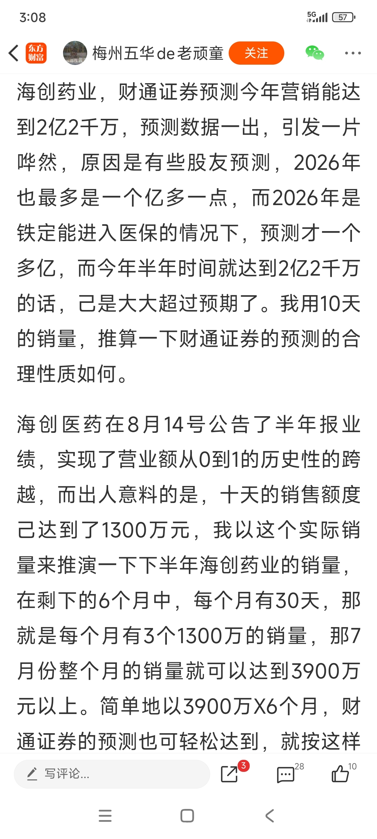 $海创药业-U(SH688302)$ 我已经截图保存,梅州五华老顽童它这个托已经无脑唱多几年了,海创药业不仅没怎么涨,只是创新药大盘在涨,在A股和港股创新药里面涨幅倒数。但梅州它自己说自己不懂药,但是忽悠别人说海创药业今年业绩能到8亿元销售额,看下面图片它的无脑推算,然后还说就算打对折也要有4亿销售额,最最最保守4亿不可能再少了。
