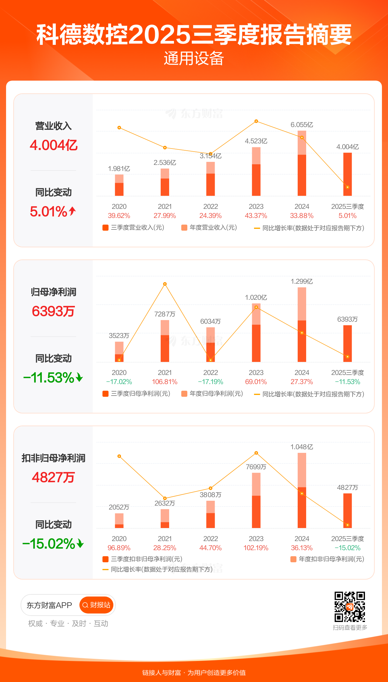 科德数控10月28日发布2025年三季报显示,公司前三季实现营业收入4.00亿元,同比增长5.01%;归母净利润6392.82万元,同比下滑11.53%;扣非归母净利润4826.51万元,同比下滑15.02%。