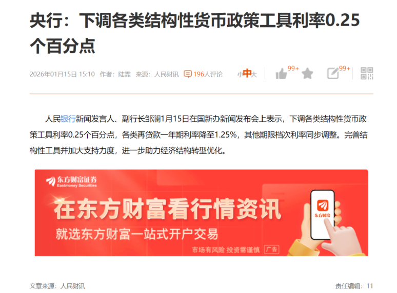 人民银行新闻发言人、副行长邹澜1月15日在国新办新闻发布会上表示,将下调各类结构性货币政策工具利率0.25个百分点,各类再贷款一年期利率降至1.25%,其他期限档次利率同步调整。完善结构性工具并加大支持力度,进一步助力经济结构转型优化。
