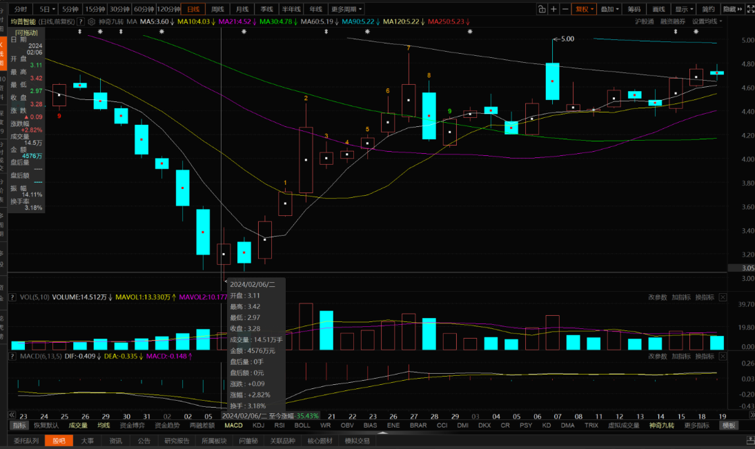 恭喜均普智能创造了2025年7月11日以来最低价,连跌7日追平了2024年2月5日的历史记录