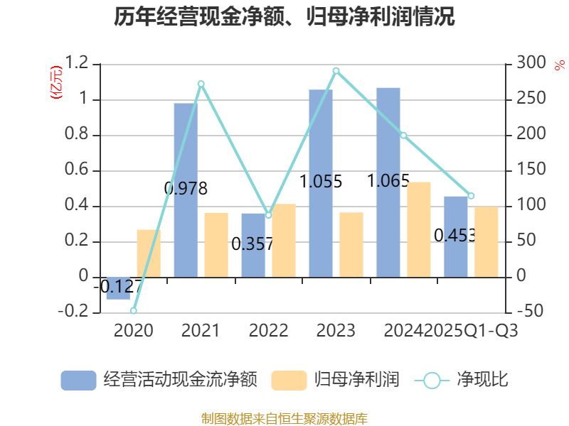 2025年前三季度,公司经营活动现金流净额为4525.31万元,同比下降57.95%;筹资活动现金流净额1.31亿元,同比增加1.87亿元;投资活动现金流净额-2.37亿元,上年同期为-3.96亿元。