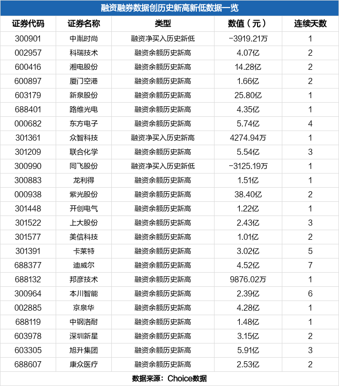 11月6日沪深两市共有136只股票两融数据创历史新高/新低,部分数据如下:
