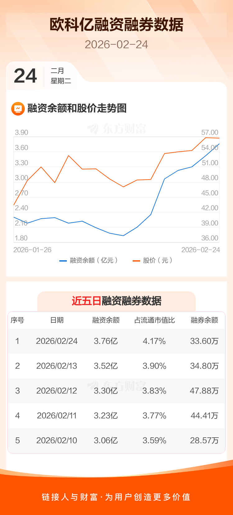 交易所最新数据显示,欧科亿于2026年2月24日获融资买入4898.16万元,融资偿还2509.32万元,当日融资净买入2388.83万元。目前,该股融资余额3.76亿,占流通市值比例为4.17%。