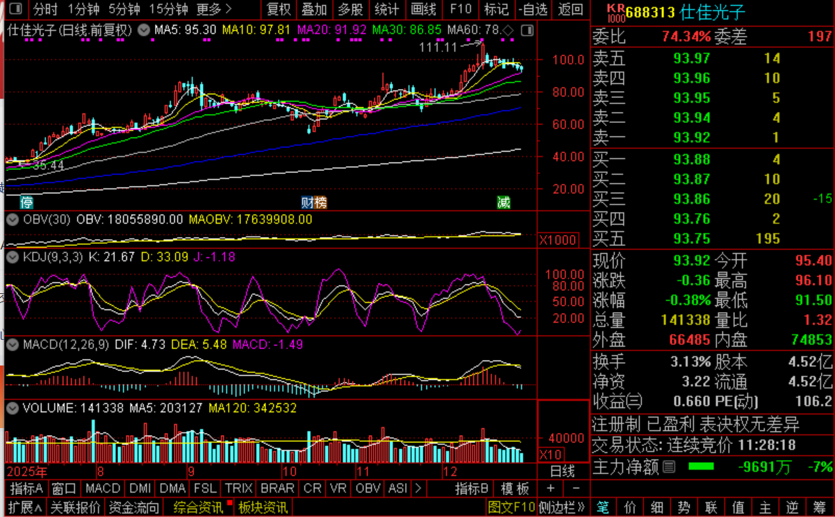 连续几天小幅下跌,成交量缩小,KDJ低位拐头。赌一下,94元补进500股。