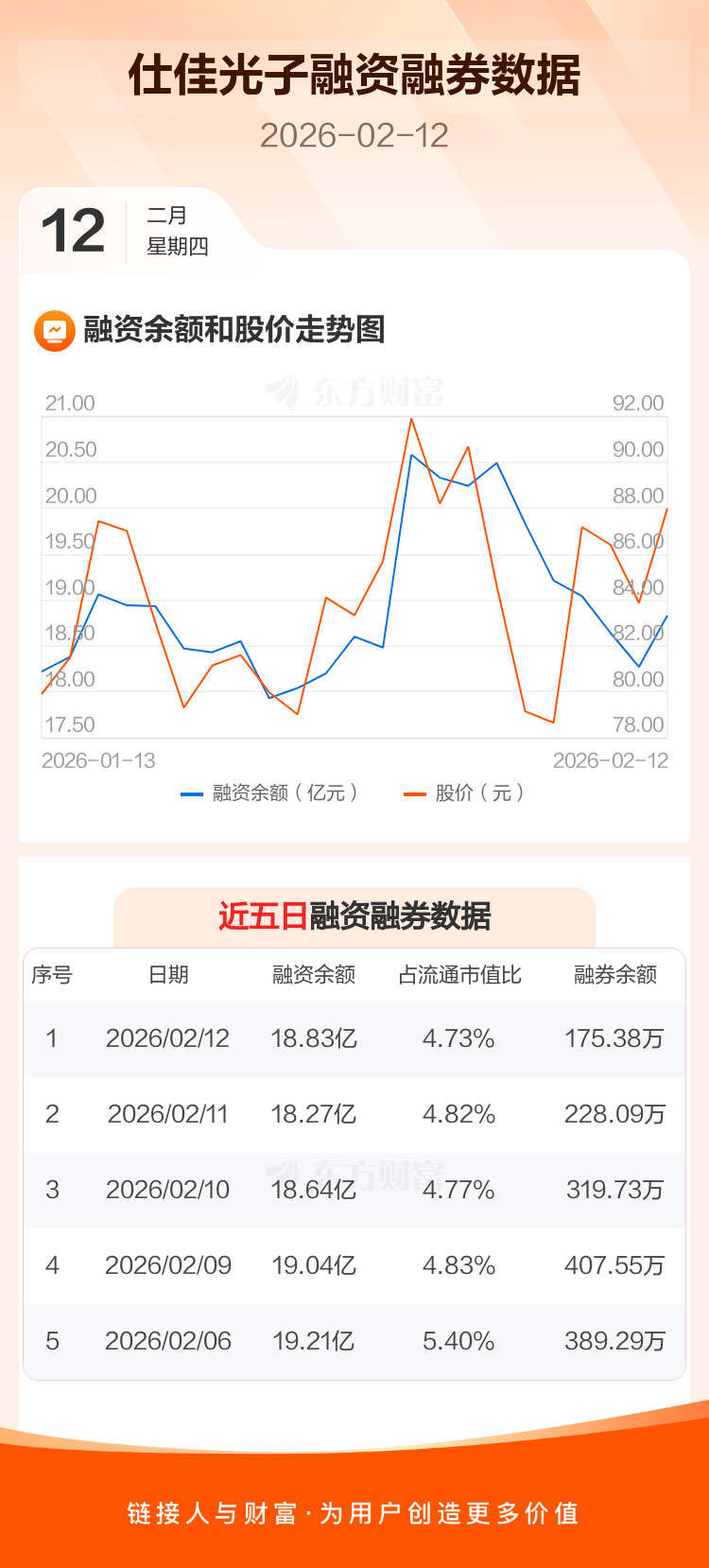 交易所最新数据显示,仕佳光子于2026年2月12日获融资买入3.04亿元,融资偿还2.48亿元,当日融资净买入5556.68万元。目前,该股融资余额18.83亿,占流通市值比例为4.73%。