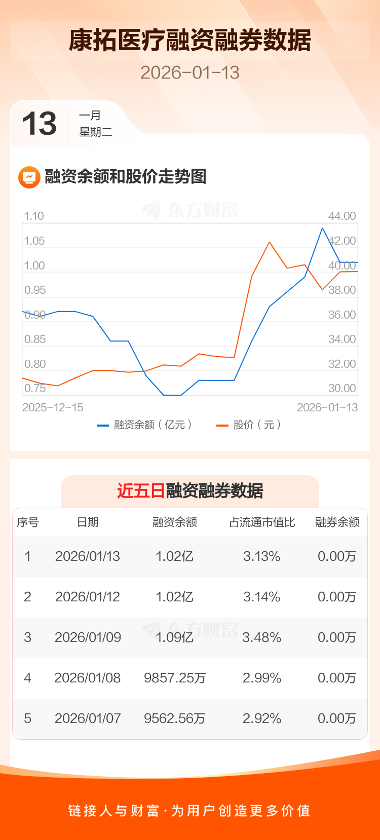 交易所最新数据显示,康拓医疗于2026年1月13日获融资买入1945.87万元,融资偿还1987.53万元,当日融资净偿还41.66万元。目前,该股融资余额1.02亿,占流通市值比例为3.13%。