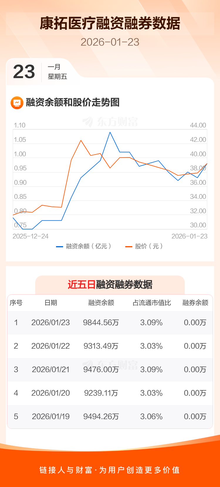 交易所最新数据显示,康拓医疗于2026年1月23日获融资买入1516.56万元,融资偿还985.49万元,当日融资净买入531.07万元。目前,该股融资余额9844.56万,占流通市值比例为3.09%。
