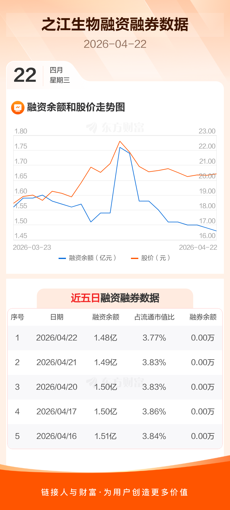 交易所最新数据显示,之江生物于2026年4月22日获融资买入216.79万元,融资偿还371.95万元,当日融资净偿还155.16万元。目前,该股融资余额1.48亿,占流通市值比例为3.77%。