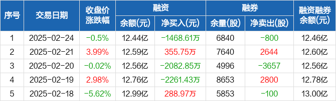 财富趋势:融资净偿还1468.61万元,融资余额12.44亿元(02-24)