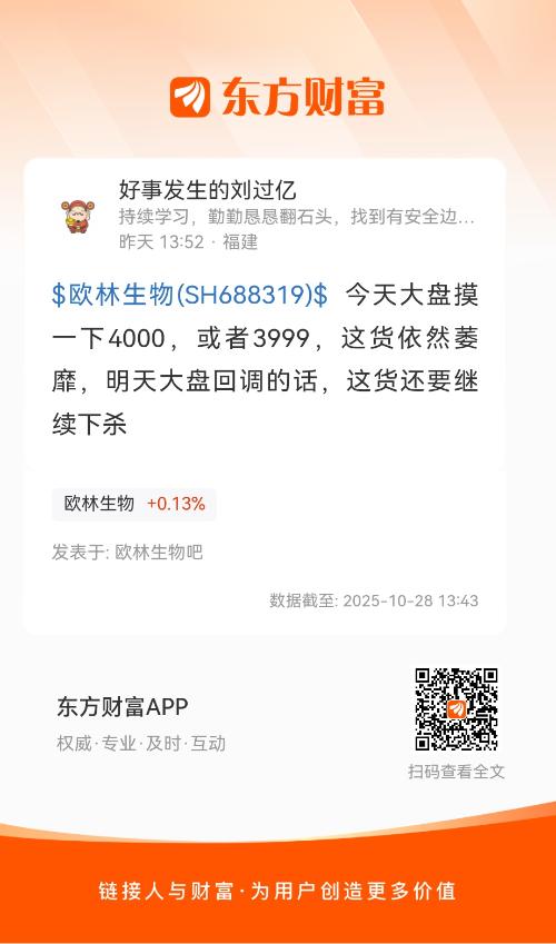 $欧林生物(SH688319)$  今天大盘摸一下4000,或者3999,这货依然萎靡,明天大盘回调的话,这货还要继续下杀