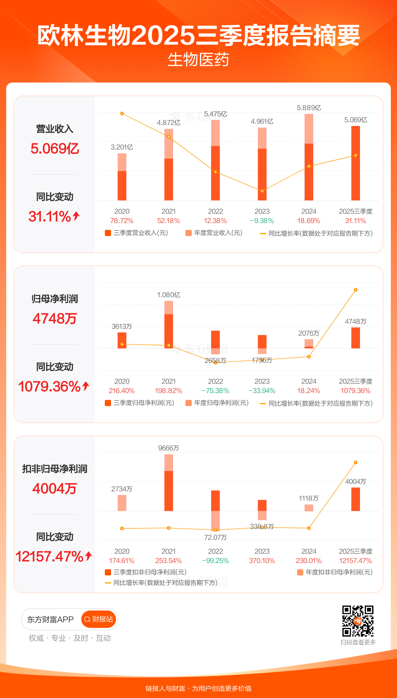 欧林生物10月30日发布2025年三季报显示,公司前三季实现营业收入5.07亿元,同比增长31.11%;归母净利润4747.98万元,同比增长1079.36%;扣非归母净利润4004.26万元,同比增长12157.47%。