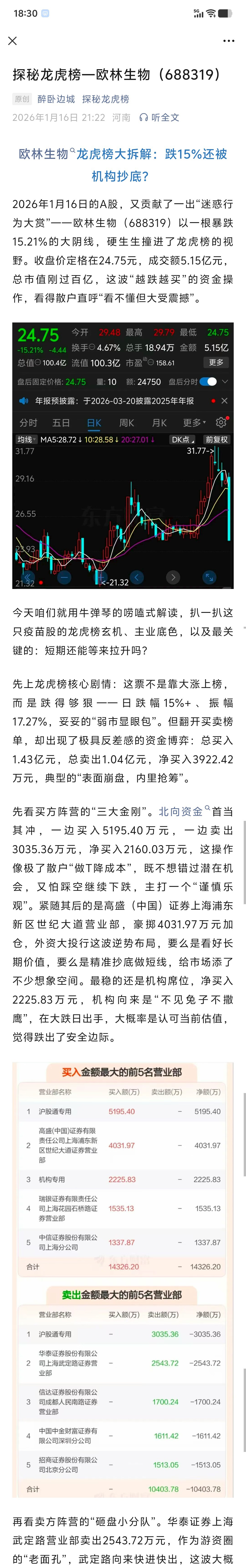 $欧林生物(SH688319)$ 2026年1月16日的A股,又贡献了一出“迷惑行为大赏”——欧林生物(688319)以一根暴跌15.21%的大阴线,硬生生撞进了龙虎榜的视野。收盘价定格在24.75元,成交额5.15亿元,总市值刚过百亿,这波“越跌越买”的资金操作,看得散户直呼“看不懂但大受震撼”。