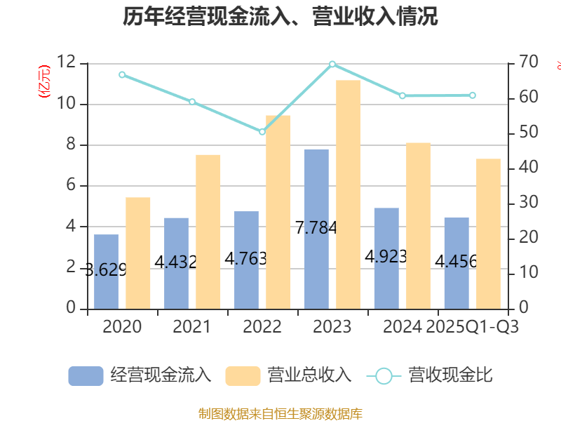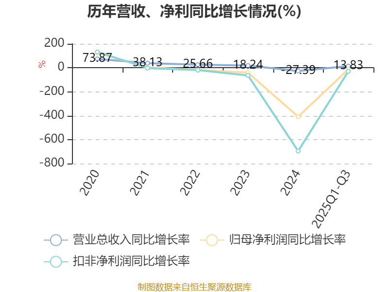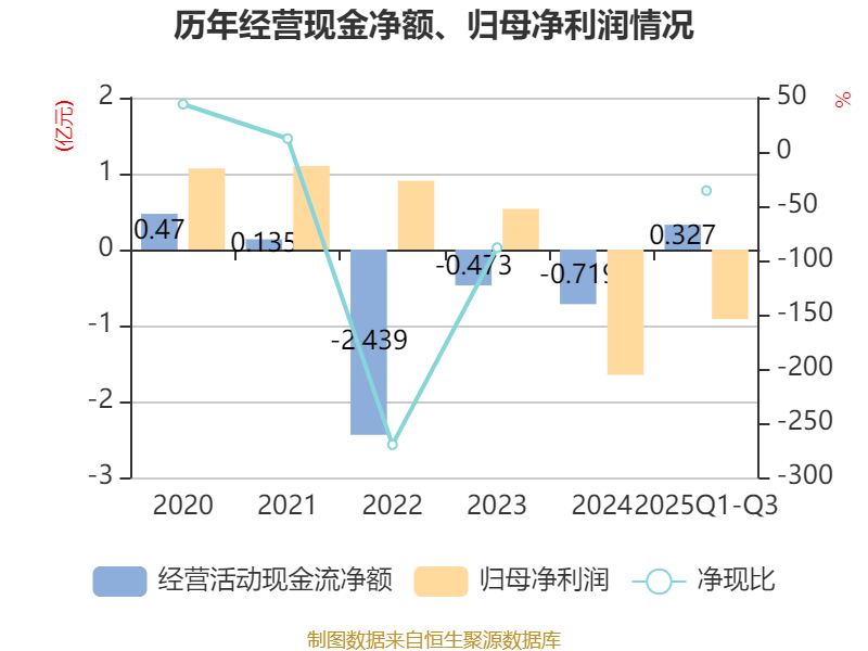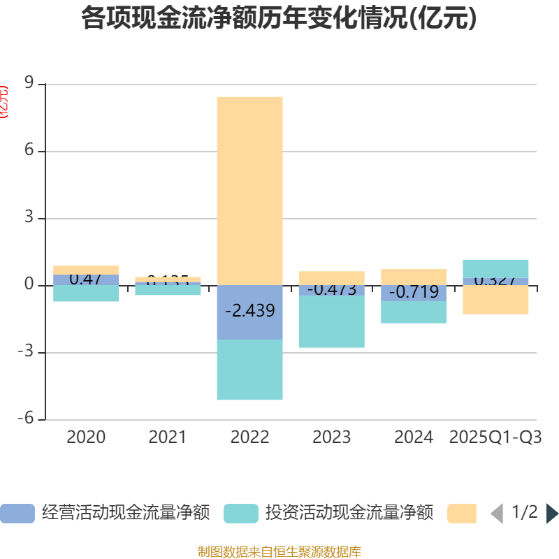2025年前三季度,公司经营活动现金流净额为3271.87万元,同比增加8262.69万元;筹资活动现金流净额-1.31亿元,同比减少1.85亿元;投资活动现金流净额8017.64万元,上年同期为-7943.29万元。