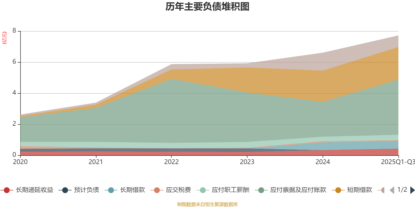 负债重大变化方面,截至2025年三季度末,公司应付票据及应付账款较上年末增加58.51%,占公司总资产比重上升6.2个百分点;合同负债较上年末增加162.05%,占公司总资产比重上升0.75个百分点;长期递延收益较上年末增加29.09%,占公司总资产比重上升0.43个百分点;衍生金融负债较上年末减少100%,占公司总资产比重下降0.34个百分点。