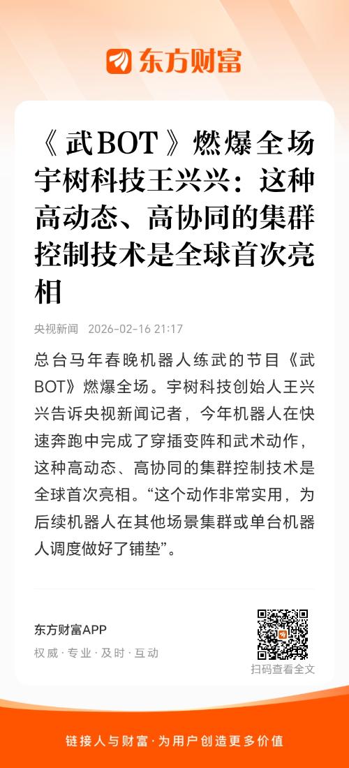 总台马年春晚机器人练武的节目《武BOT》燃爆全场。宇树科技创始人王兴兴告诉央视新闻记者,今年机器人在快速奔跑中完成了穿插变阵和武术动作,这种高动态、高协同的集群控制技术是全球首次亮相。“这个动作非常实用,为后续机器人在其他场景集群或单台机器人调度做好了铺垫”。