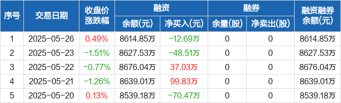 赛微微电:融资净偿还12.69万元,融资余额8614.85万元(05-26)