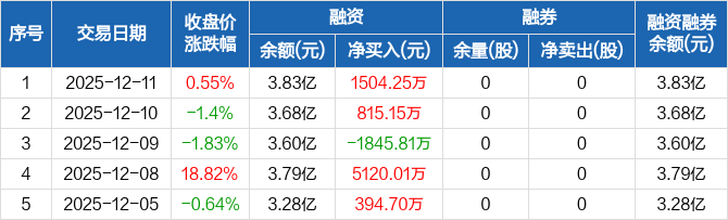 赛微微电融资融券信息显示,2025年12月11日融资净买入1504.25万元;融资余额3.83亿元,较前一日增加4.08%