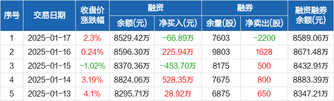 经纬恒润:融资净偿还66.89万元,融资余额8529.42万元(01-17)