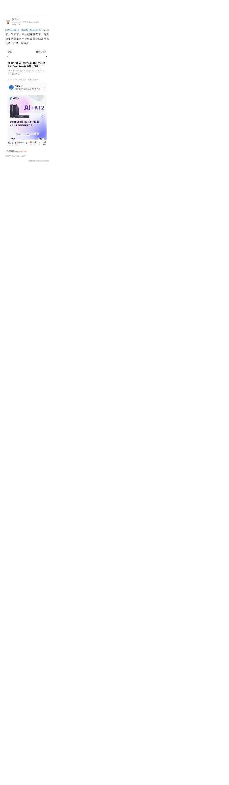 $云从科技-UW(SH688327)$  又来了,又来了,云从彻底爆发了,明天我要把资金从半导体设备中抽回来搞云从,云从,等等我