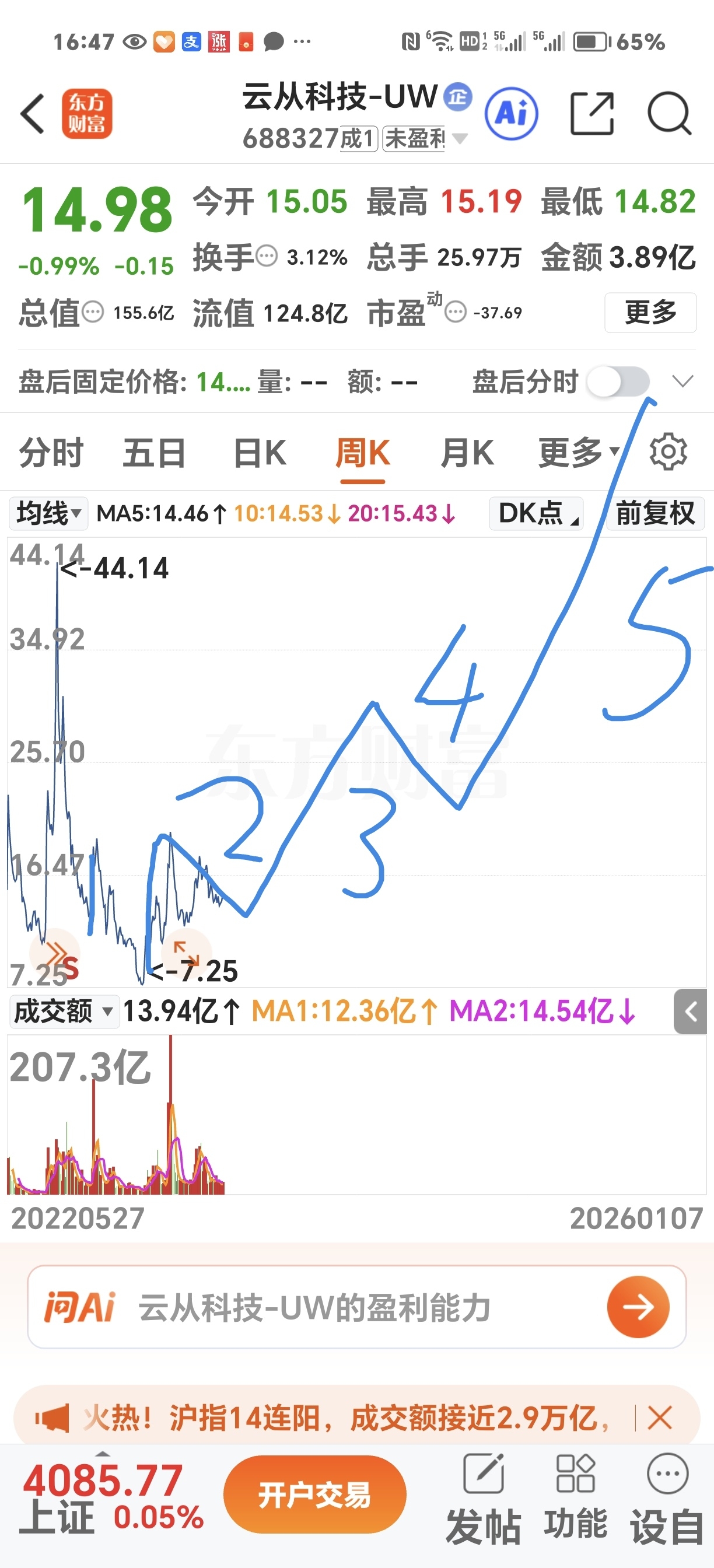 $云从科技-UW(SH688327)$ 云从的5浪牛市图:2浪调整己经结束,现在运行在3浪上升阶段