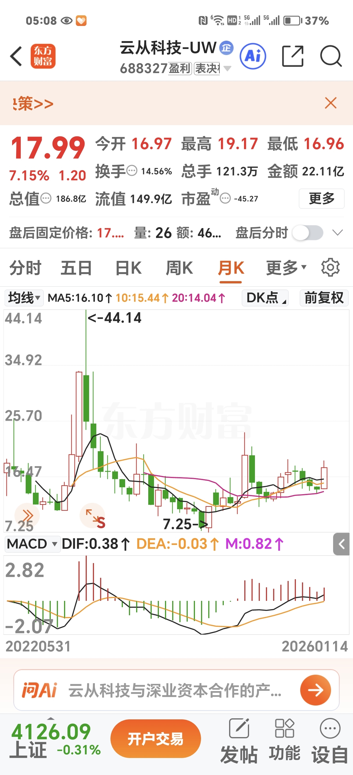 $云从科技-UW(SH688327)$ 从云从科技月K线看,她刚刚进入主升浪,这波大行情会去挑战44,64还是84,仁者见仁智者见智