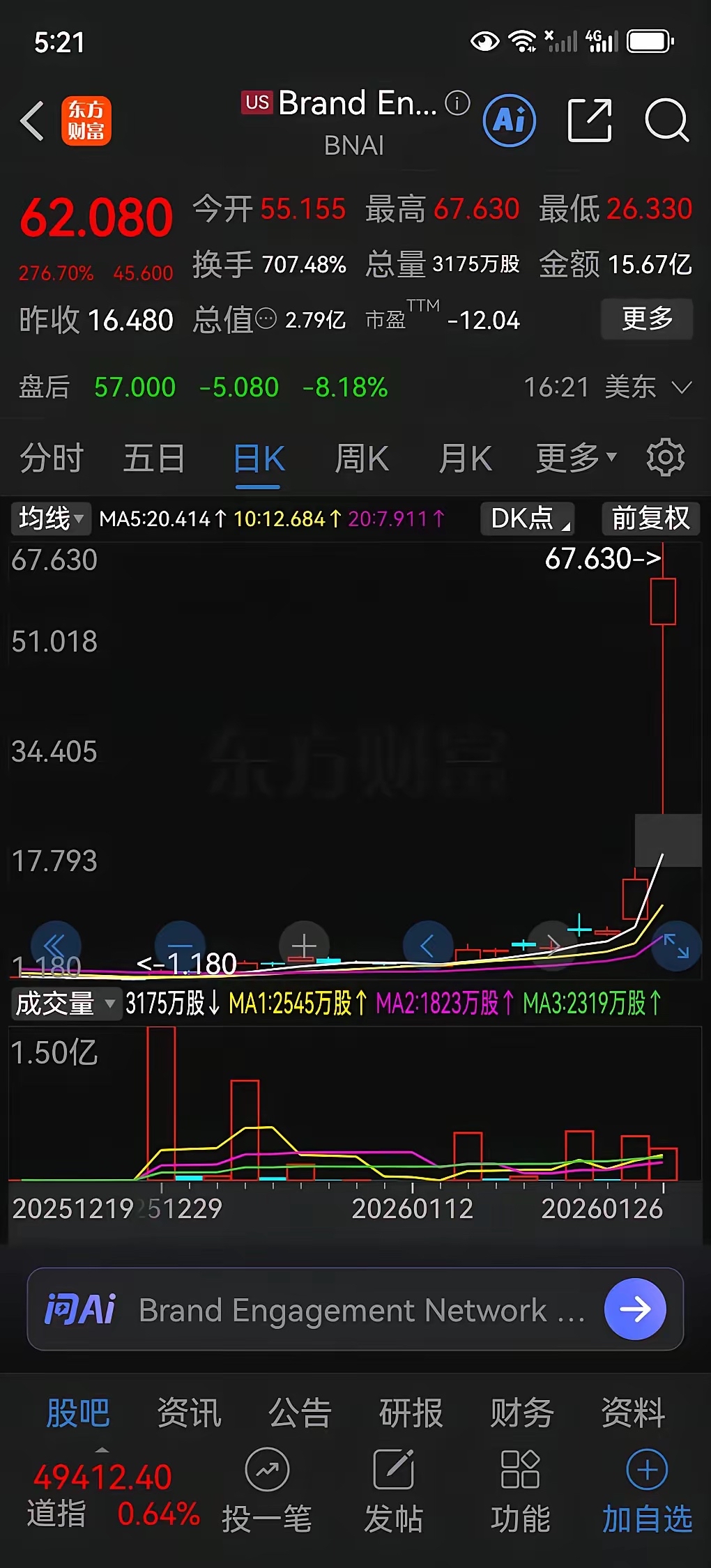 昨夜美股传来大消息,AI应用BNAI一夜又暴涨276%,两天累计涨幅800%了。