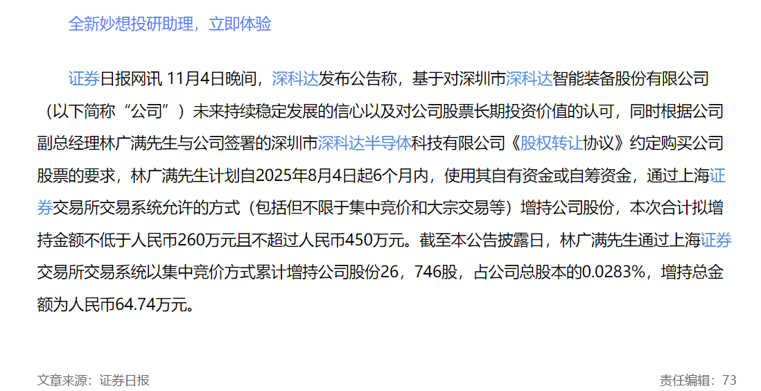 深科达副总经理林广满先生以实际行动增持公司股份,彰显管理层对公司未来发展的坚定信心与长期价值认可!
