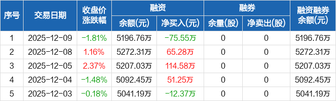 艾隆科技:融资净偿还75.55万元,融资余额5196.76万元(12-09)