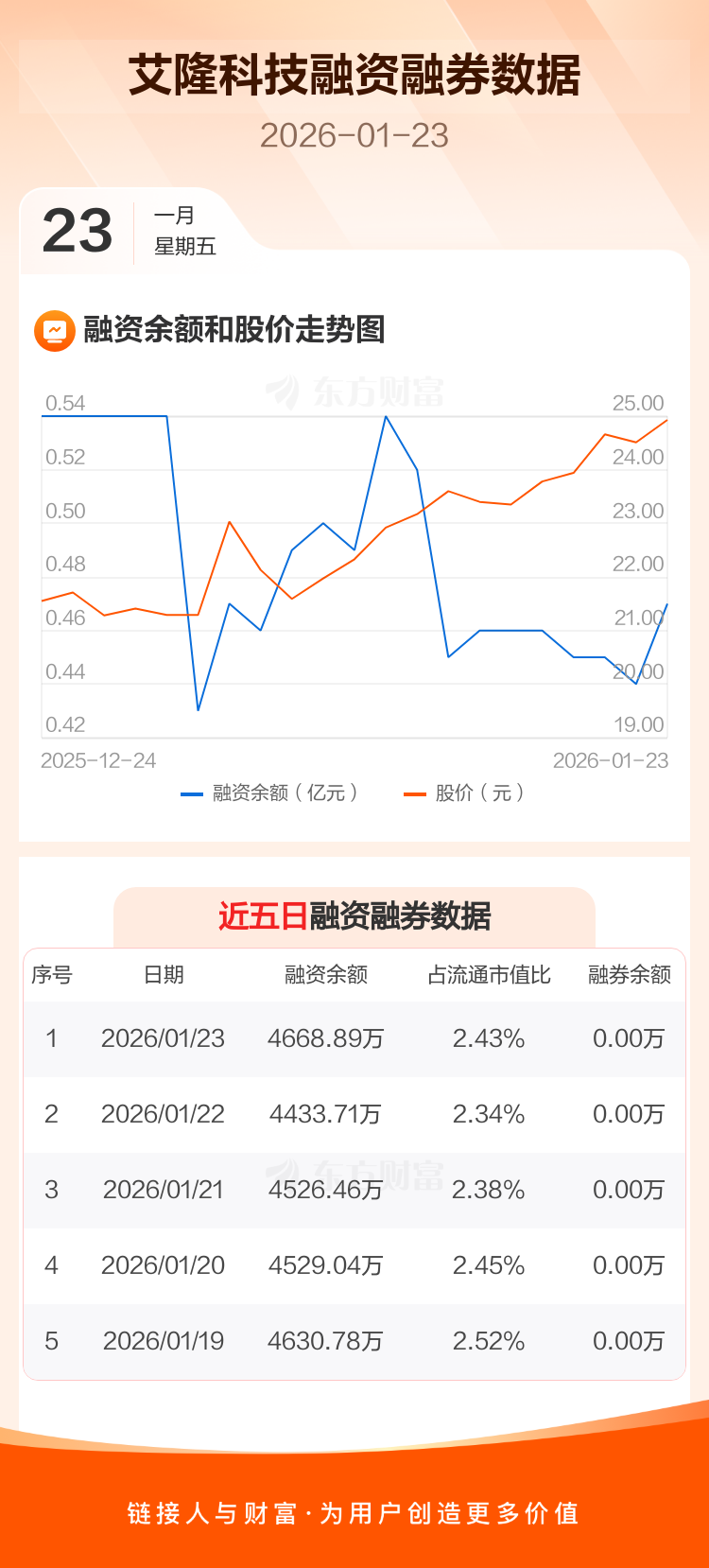 交易所最新数据显示,艾隆科技于2026年1月23日获融资买入515.18万元,融资偿还279.99万元,当日融资净买入235.18万元。目前,该股融资余额4668.89万,占流通市值比例为2.43%。