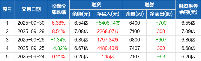 中科蓝讯:融资净偿还5406.14万元,融资余额6.54亿元(09-30)