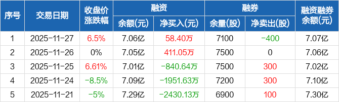 中科蓝讯:融资净买入58.4万元,融资余额7.06亿元(11-27)