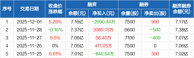 融资方面,当日融资买入1.93亿元,融资偿还2.14亿元,融资净偿还2090.44万元。融券方面,融券卖出900股,融券偿还0股,融券余量7500股,融券余额114.11万元。融资融券余额合计7.17亿元。