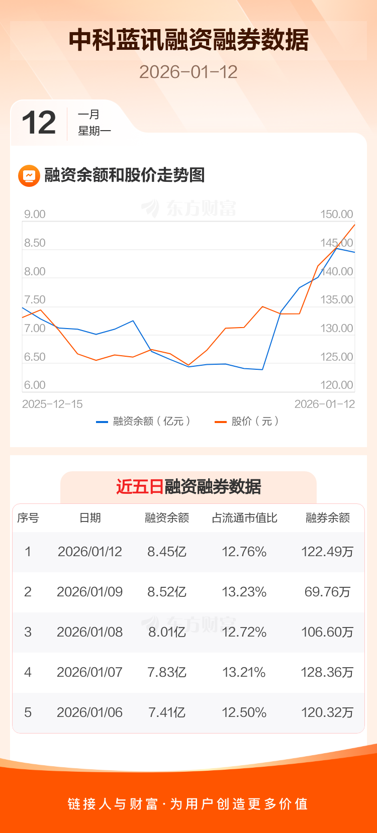 交易所最新数据显示,中科蓝讯于2026年1月12日获融资买入2.03亿元,融资偿还2.10亿元,当日融资净偿还763.63万元。目前,该股融资余额8.45亿,占流通市值比例为12.76%。