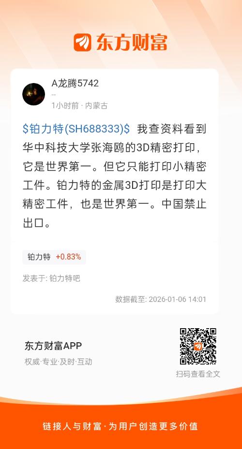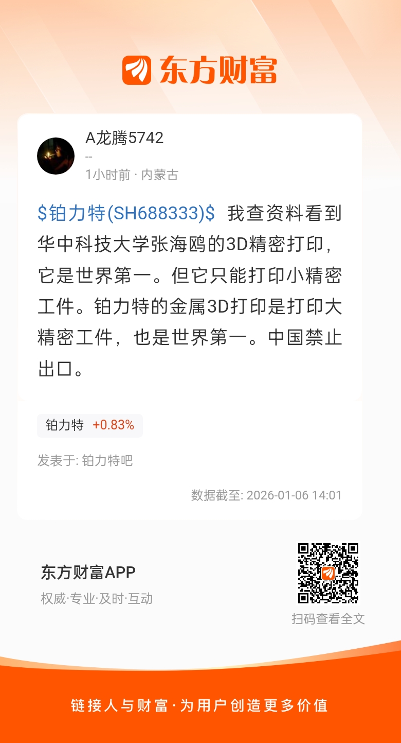 $铂力特(SH688333)$ 我查资料看到华中科技大学张海鸥的3D精密打印,它是世界第一。但它只能打印小精密工件。铂力特的金属3D打印是打印大精密工件,也是世界第一。中国禁止出口。
