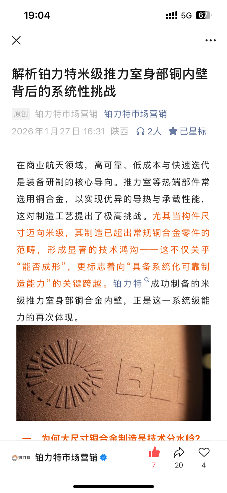 $铂力特(SH688333)$ 此次米级推力室铜内壁的成功制备印证了金属3D打印在实现此类大尺寸复杂构件一体化成形上的技术高度,更标志着铂力特以系统性制造能力,为商业航天发展提供了扎实的工程化支撑。未来,铂力特将持续深耕航空航天领域,以经过验证的全流程闭环能力,推动更多前沿设计高效转化为可信赖的应用,为商业航天的产业化进程夯实制造基石。